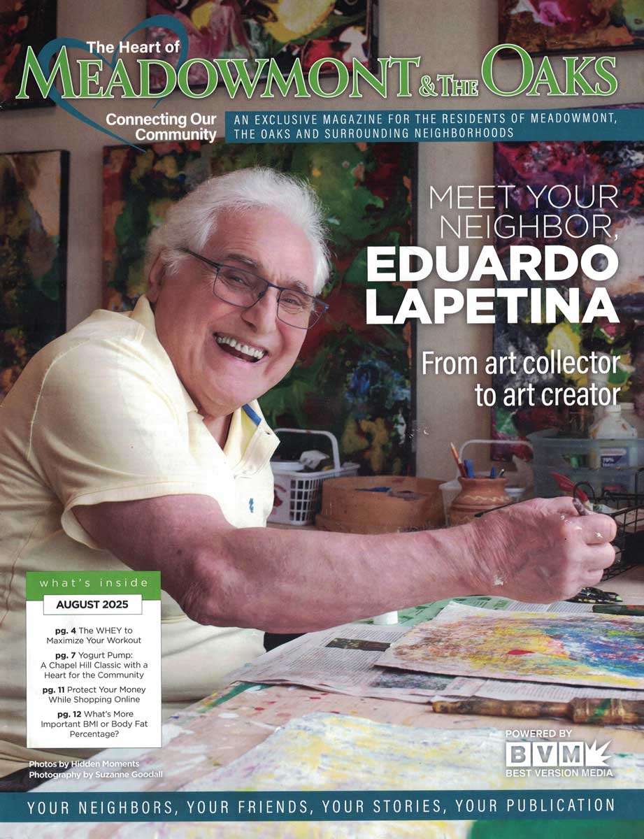 Chapel Hill’s The Heart of Meadowmont and The Oaks featured a profile of Eduardo in its August, 2025 issue.